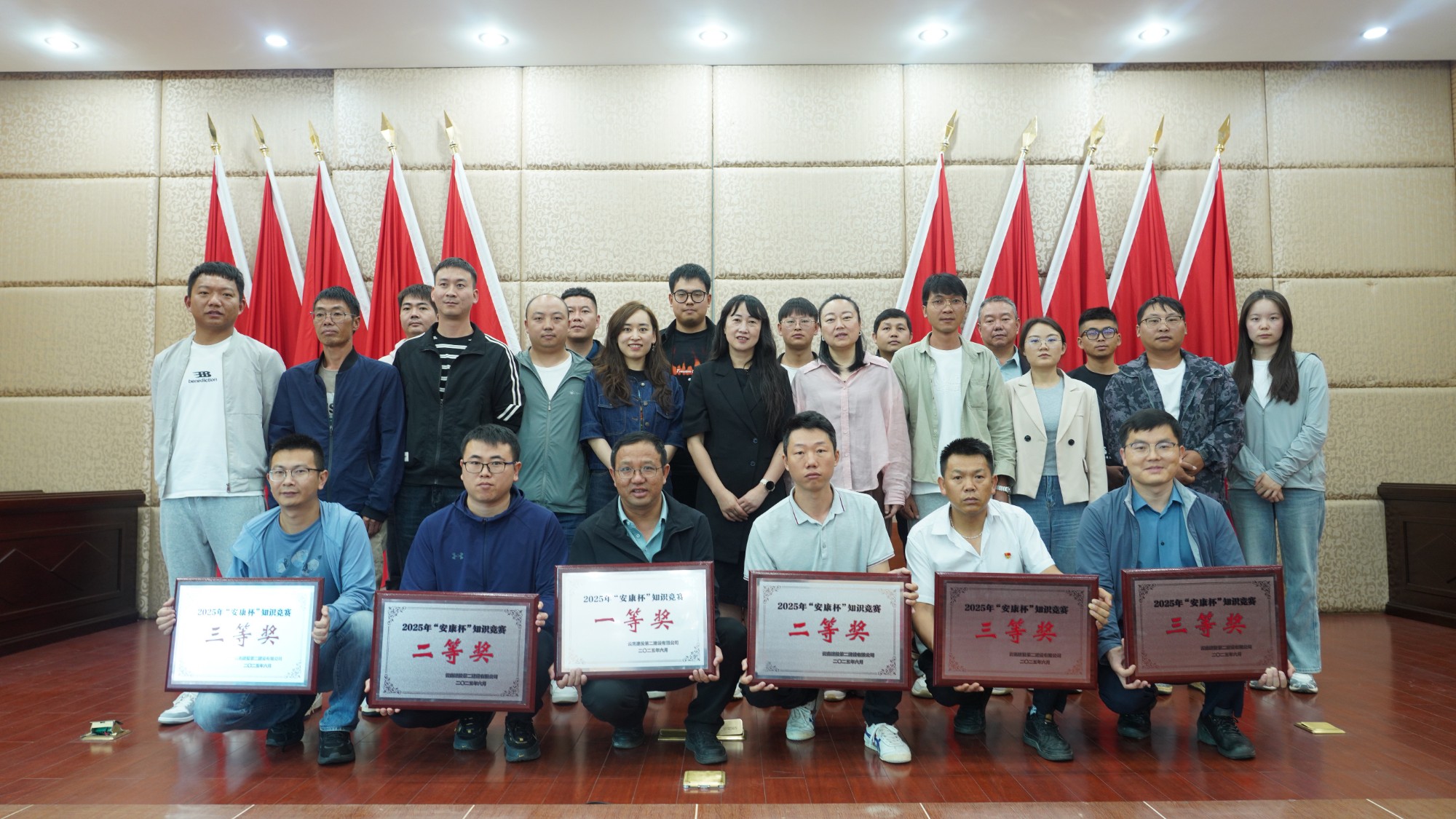 本次競賽采用集團(tuán)“云南建投學(xué)習(xí)成長平臺”線上答題形式,旨在以賽促學(xué)、以賽促產(chǎn),提升全員安全生產(chǎn)意識,助推公司項目管理提質(zhì)增效。比賽中,各參賽隊嚴(yán)格遵守競賽規(guī)則,選手們?nèi)褙炞?、認(rèn)真答題,展現(xiàn)出了扎實的安全生產(chǎn)知識功底與嚴(yán)謹(jǐn)?shù)谋荣悜B(tài)度。經(jīng)過激烈的角逐,最終有6支隊伍脫穎而出。第十二直管部榮獲一等獎,第九直管部、市政分公司摘得二等獎,第一直管部、第六直管部、第七直管部獲得三等獎。公司領(lǐng)導(dǎo)分別為獲獎隊伍頒獎并合影留念。